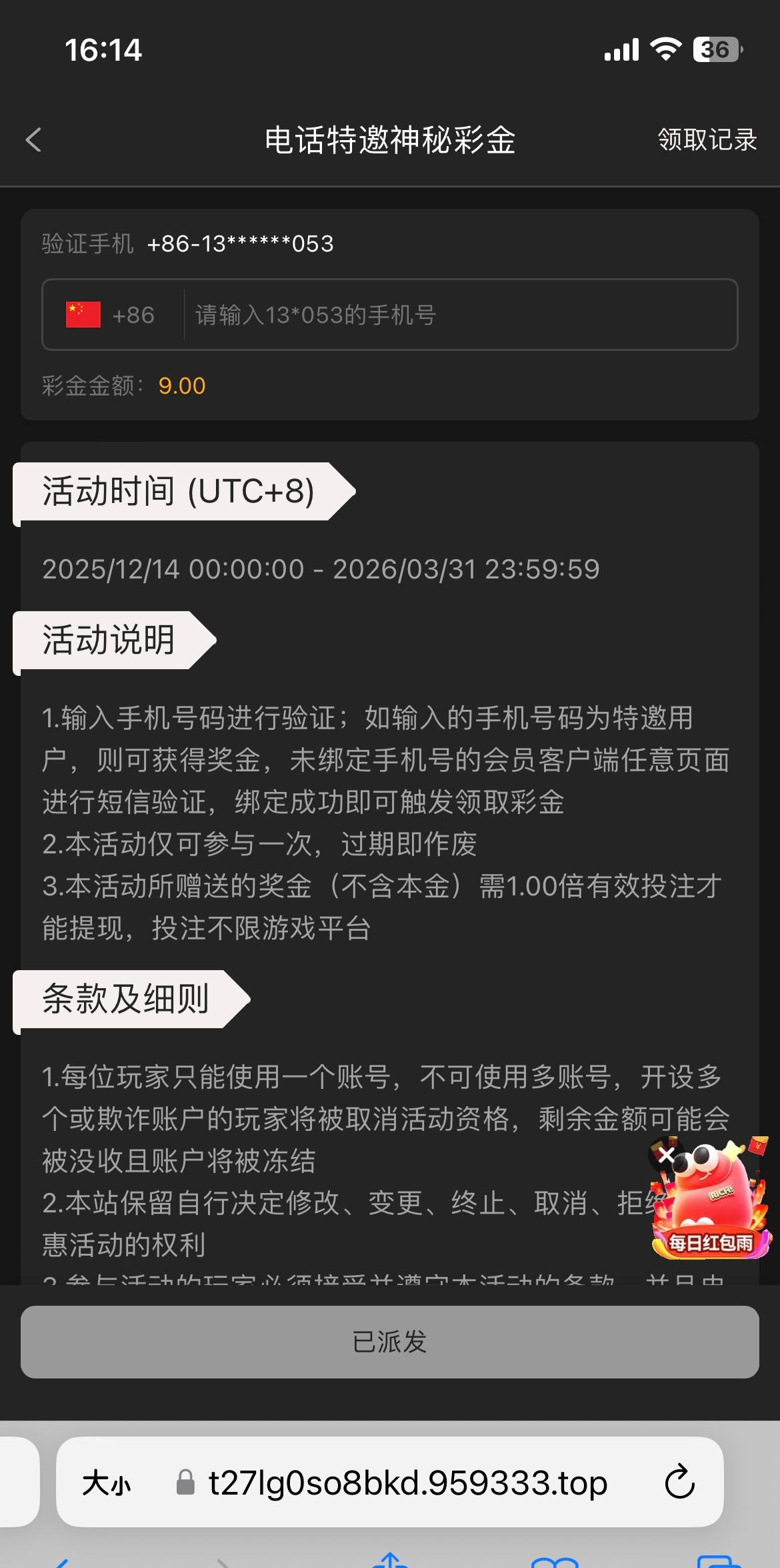 接到电话的,没接到可以上去也试试,在活动页面,自己申请,我没打出来,出款自测链接959.com
