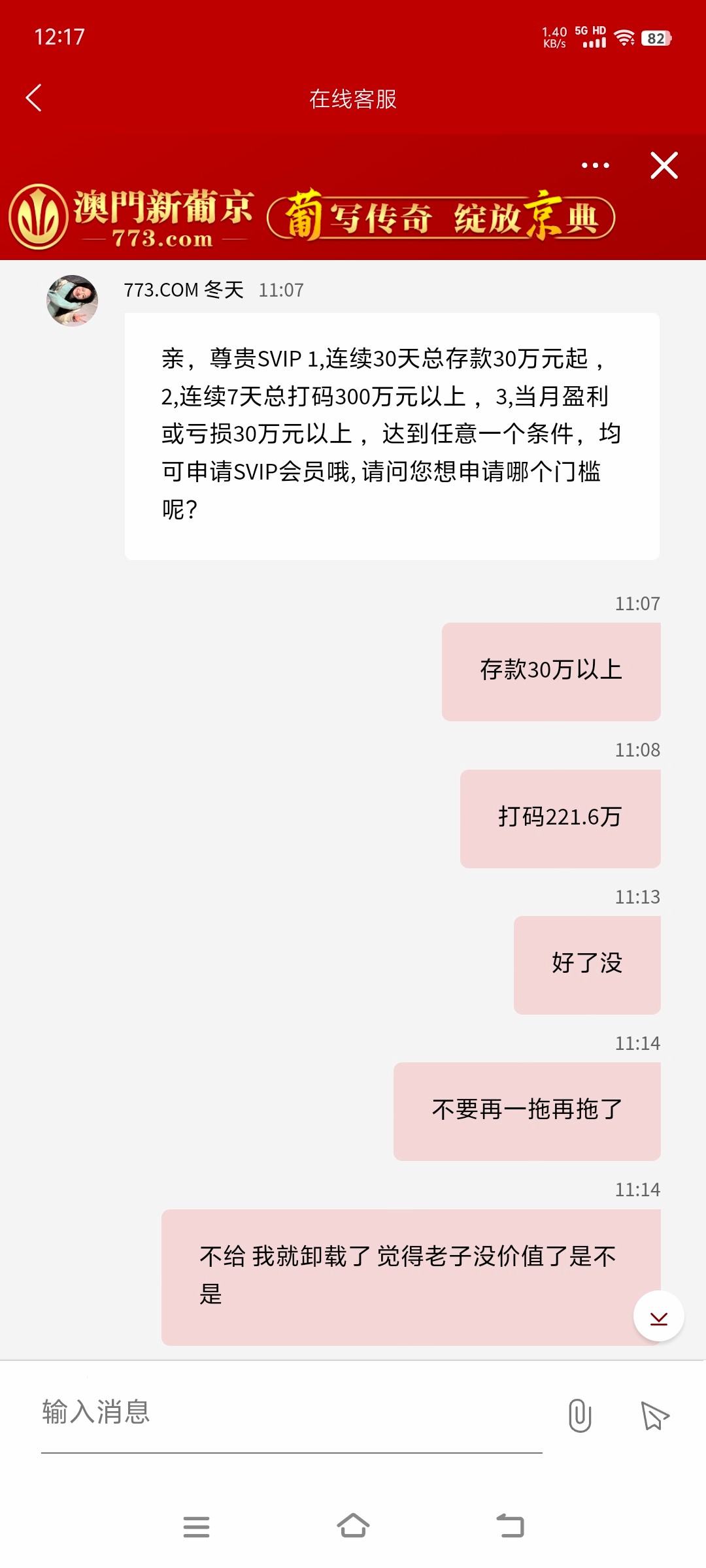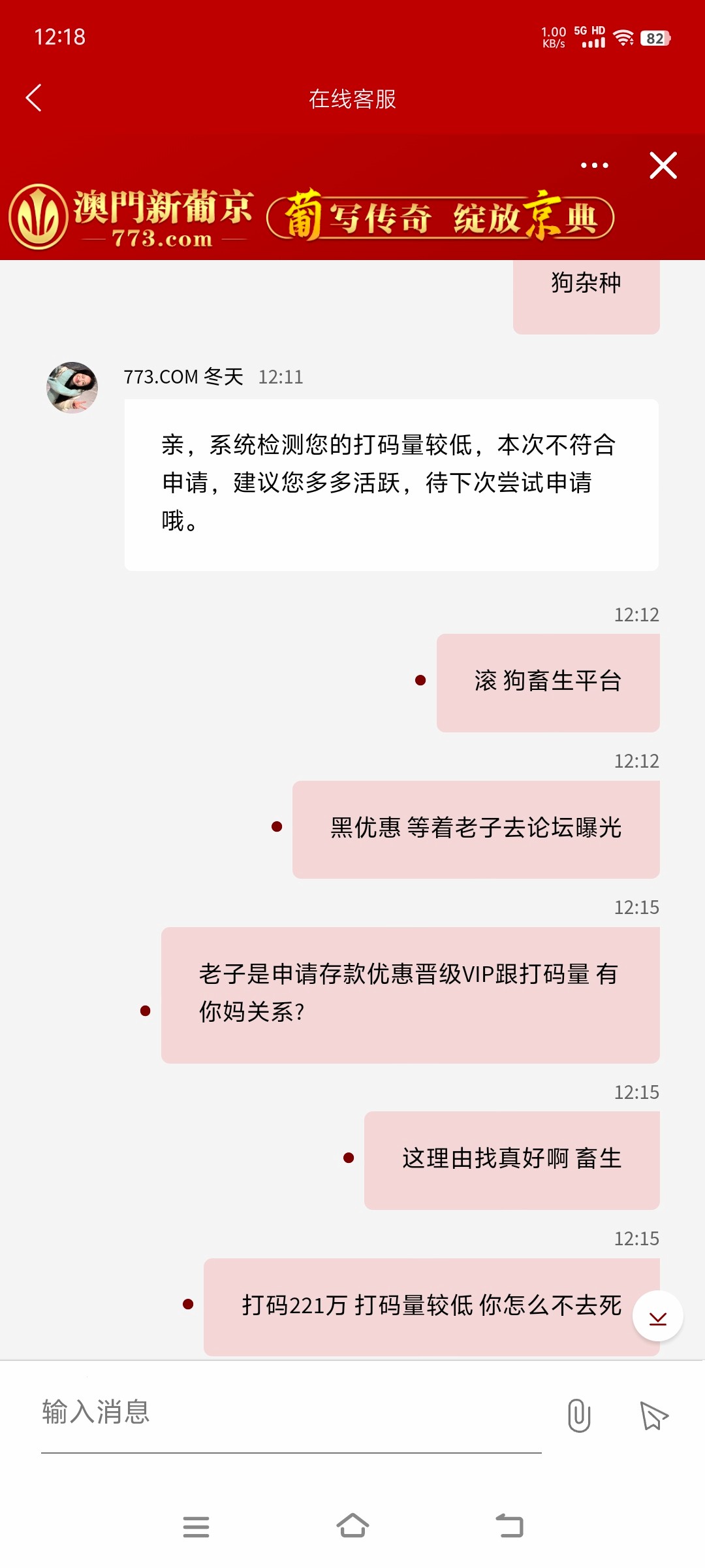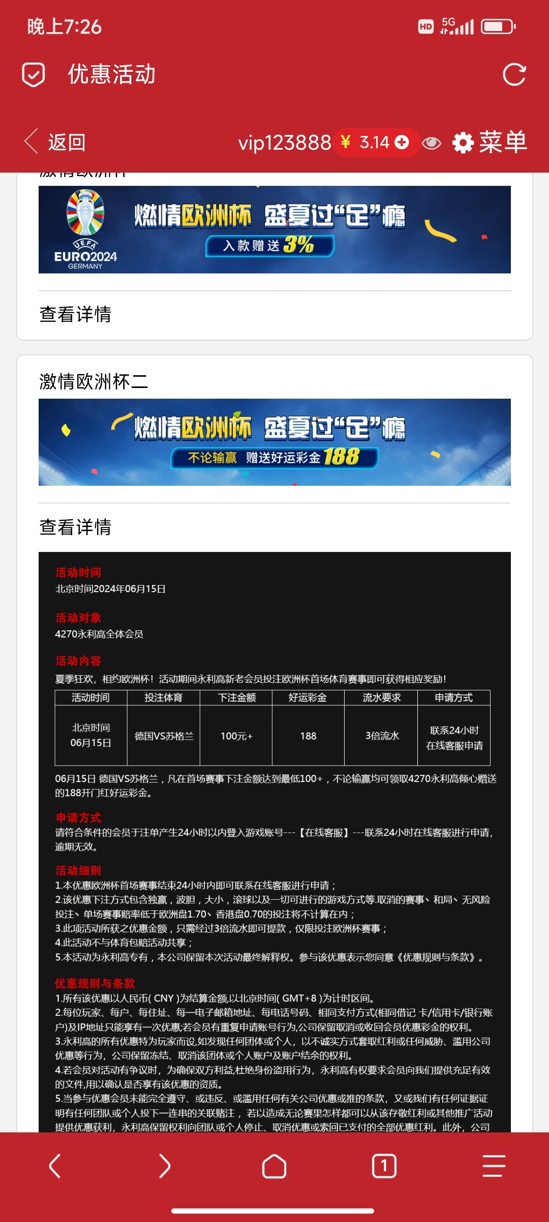 被黑1888 事情是这样的 从白嫖开始玩 500本金打到10w 充充提提 总体来说还是赚了 一万多 守不住两个小时送回去8个多 前前后后充值有50万左右 提现也差不多 明摆着黑优惠 奉劝大家不要赌了 真的看不到未来