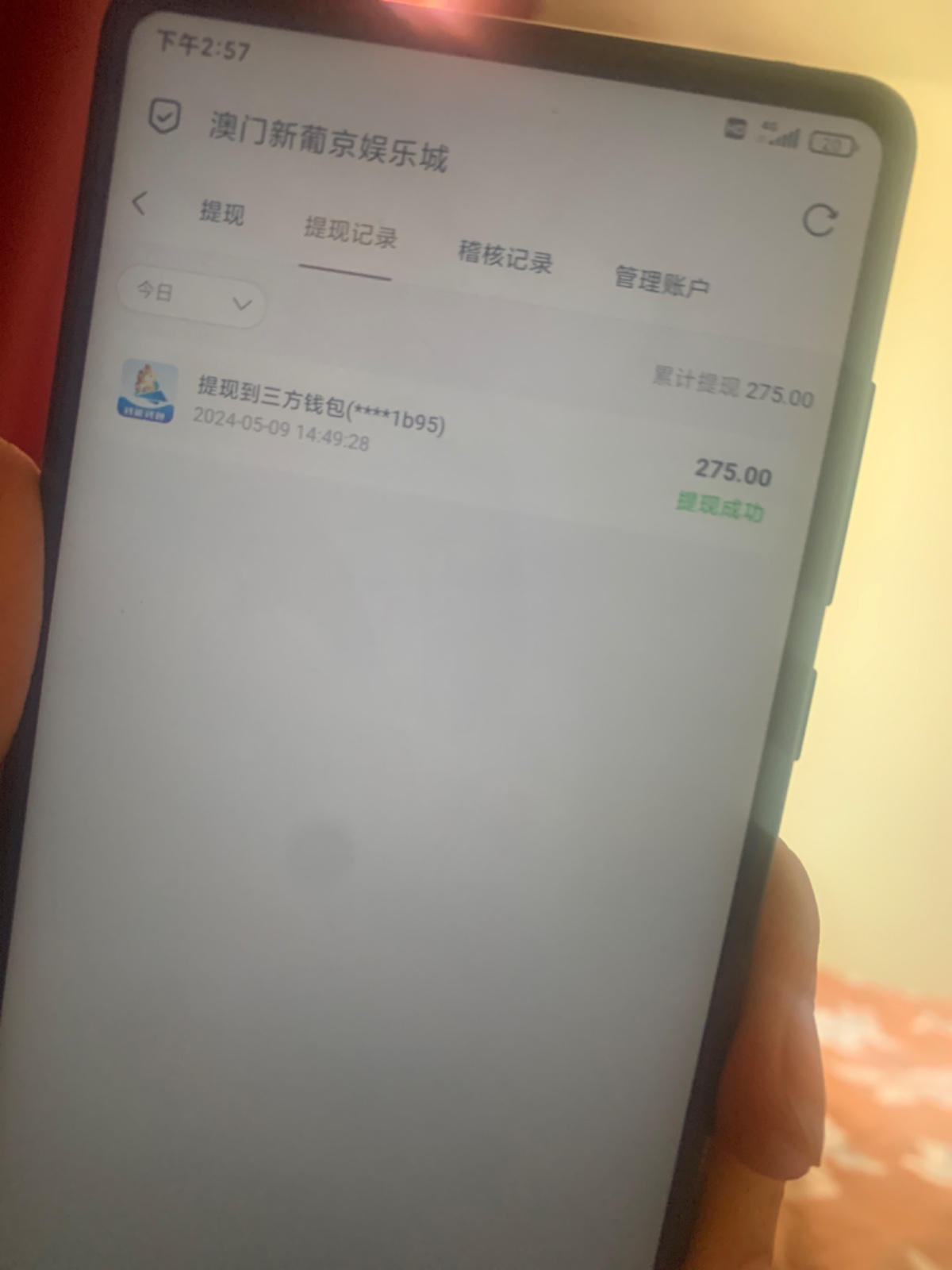 第一次时候就二块钱赢了1.8k给了手持出了 这次五一送的彩金38也出了2.1k 以为这次不可能提现的了 没想到还给两分钟就到钱包了