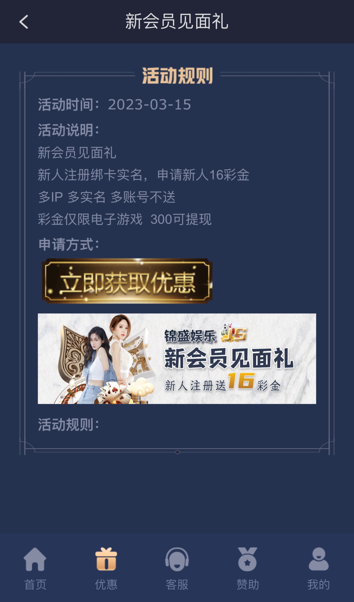 新用户注册绑卡完善信息/优惠里面自行申请16/彩金仅限于电子游戏
