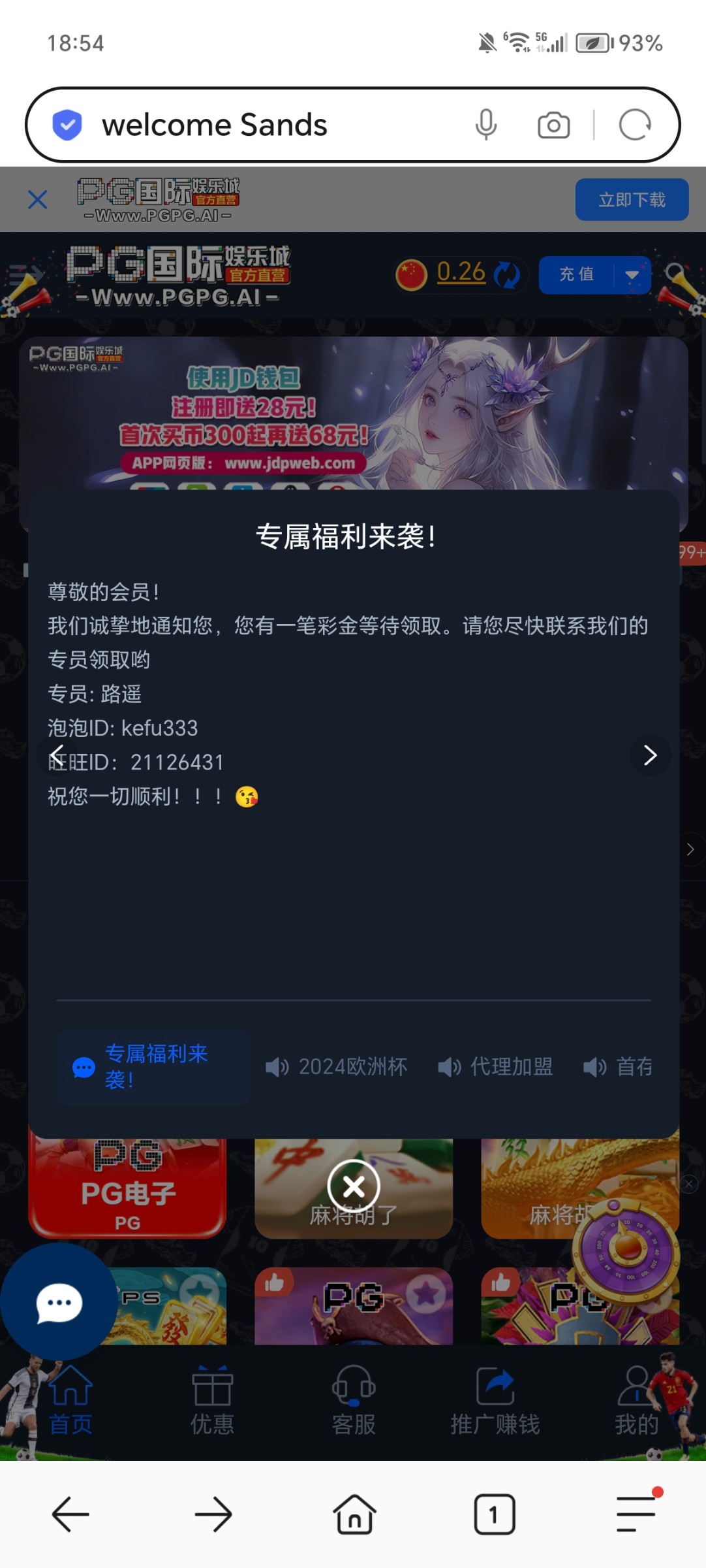 这个平台有号的去看看有没有这条消息,有找旺旺客服或者泡泡客服领取18彩金,我很久没充值也领了,新号注册送8-18联系客服领取