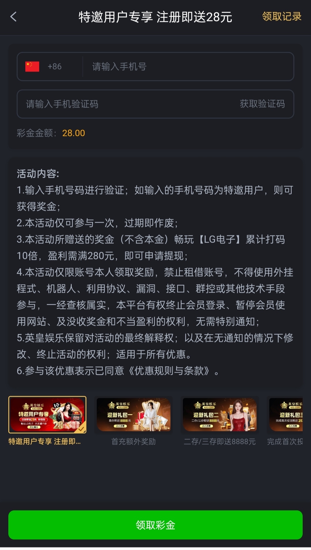 新出的活动,验证短信秒到28彩金,限制LG电子10倍流水280出款,具体自测吧