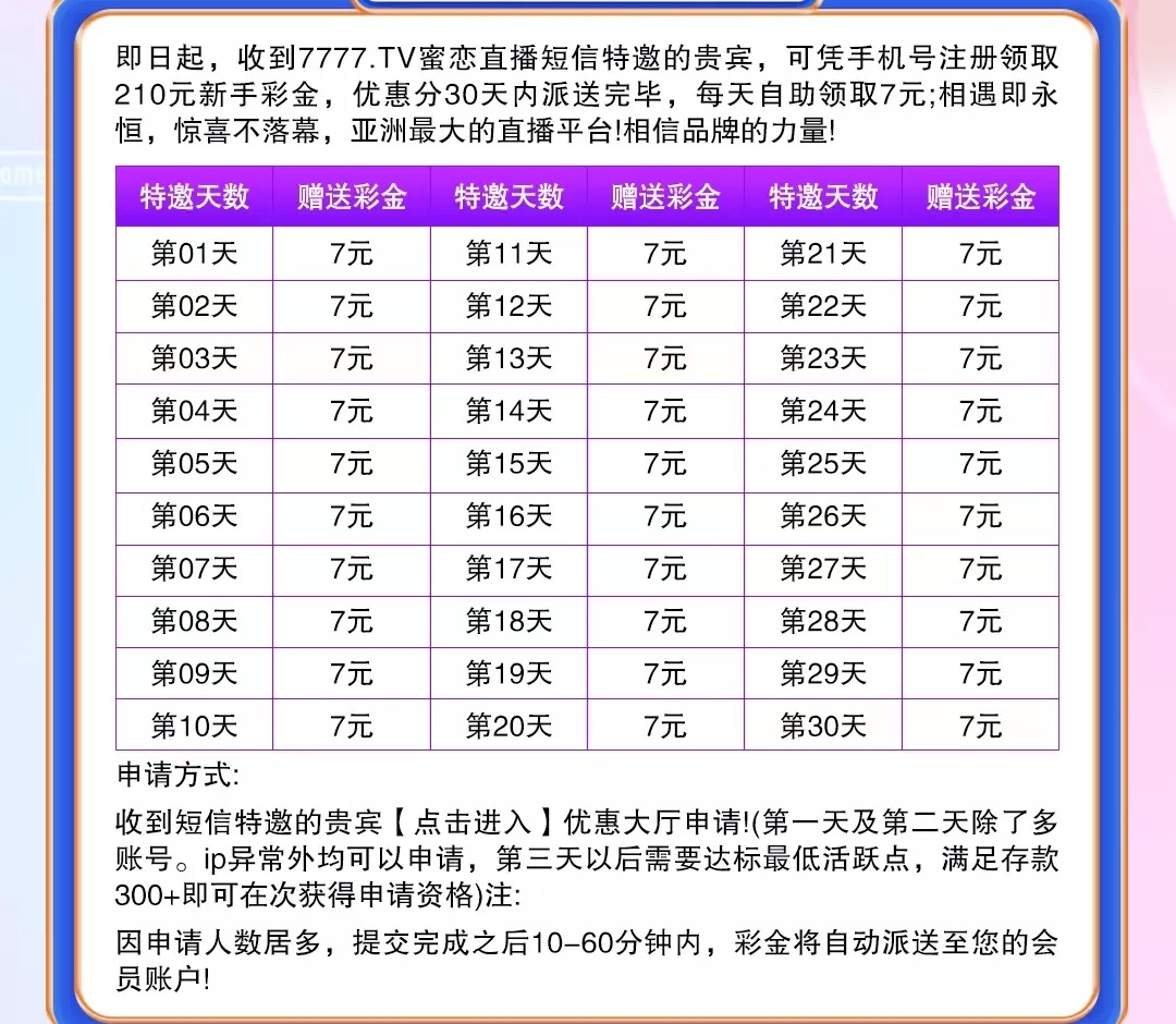 新用户注册绑卡~点优惠大厅/短信特邀/活动办理,自助申请申请特邀彩金送7/100提,只能申请第1和第2期后面要有充值