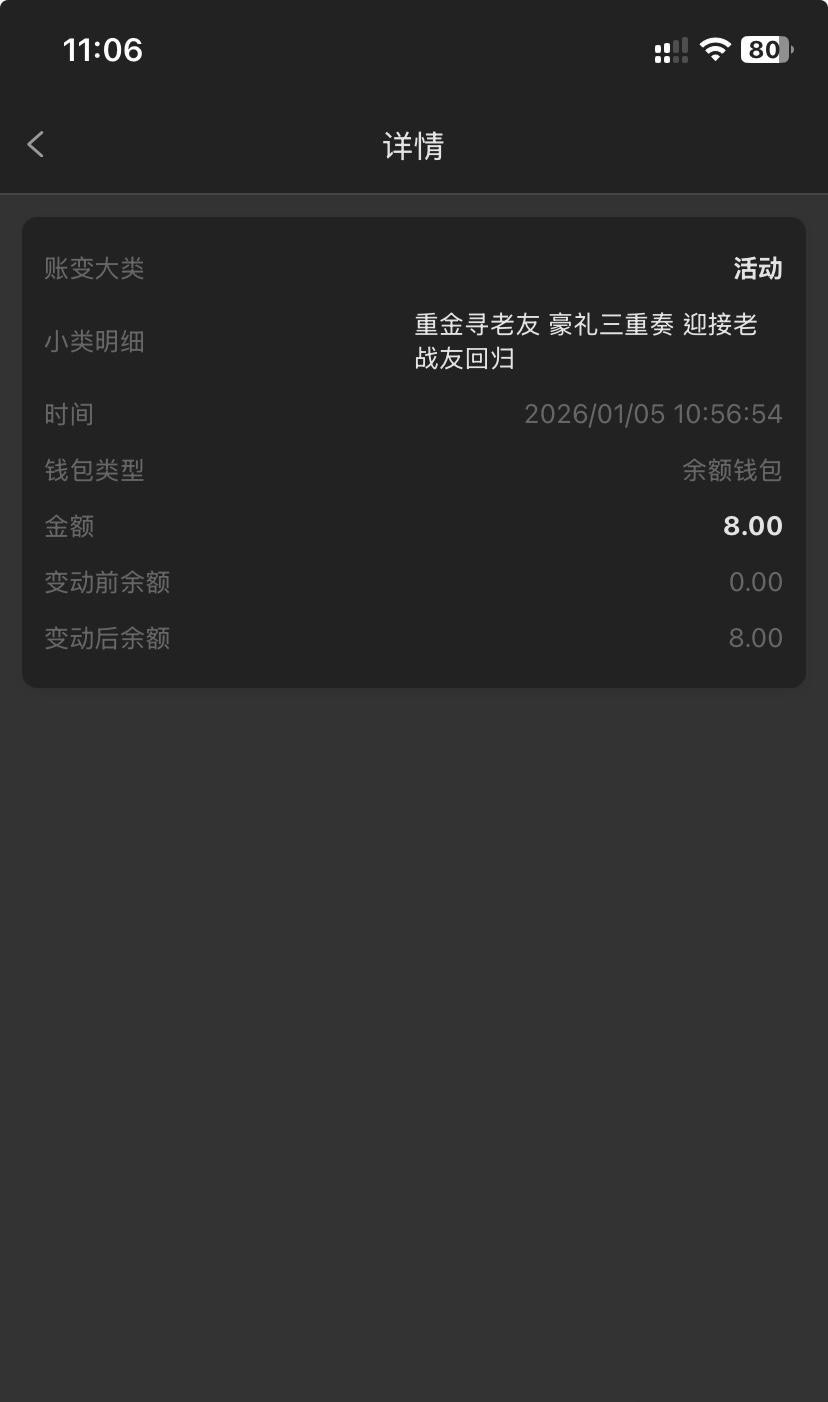 有账号的老哥上号看看有没有回访彩金 我上个月注册的没有充值过 所以才送了8块钱链接0530.com