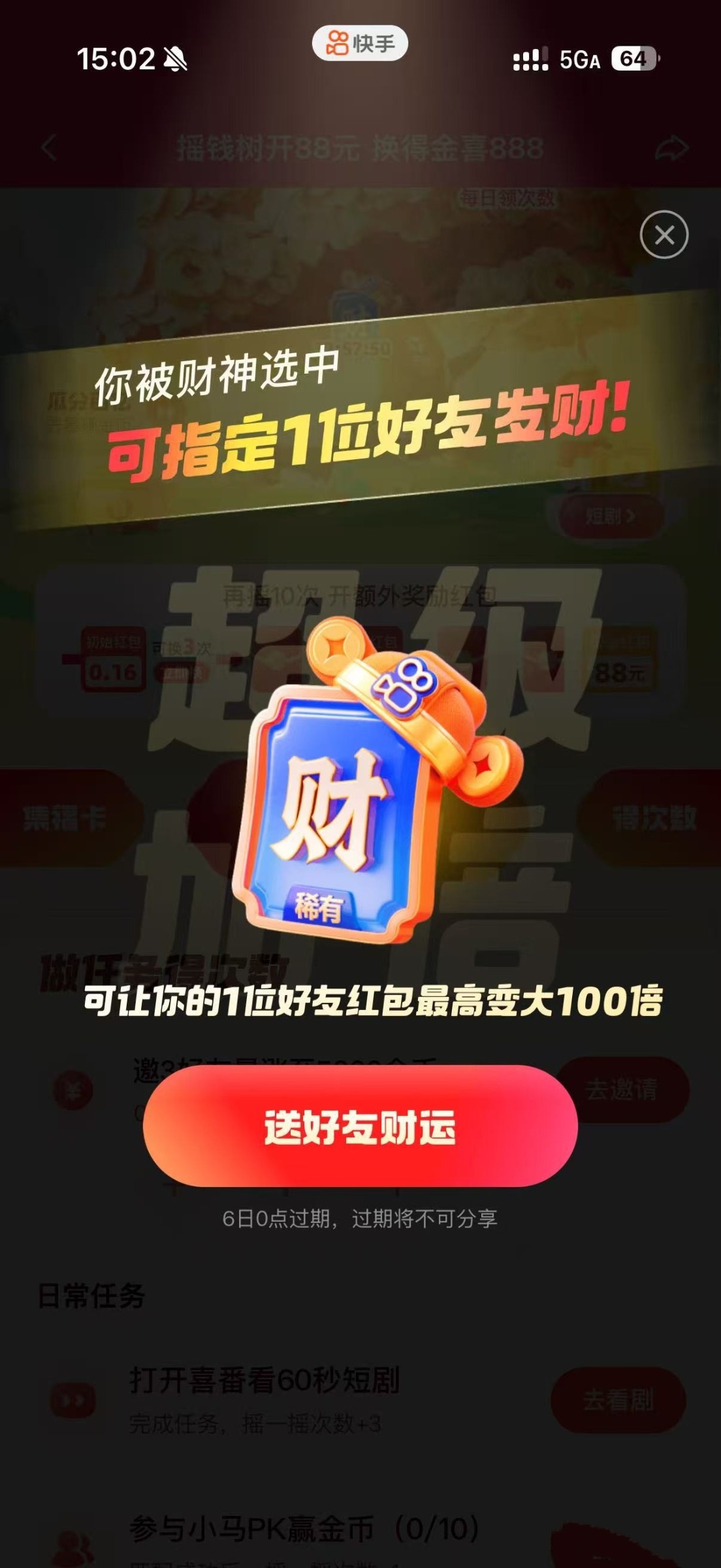 快手搜摇摇发财树 整理了下玩法,首先把任务全部做完,然后再去摇,摇到出了那个财神卡为止,看还剩下几个摇的次数,还能开几个红包,尽量往后面大一点的红包开了再去翻倍。看广告也会给财神卡 有财神卡大概率66/88 有些黑号是搞不到财神卡的 大家自测吧 有财神卡不想玩也可以去卖掉 20+ 他们现在好多88/66还有366 666的 今天刚出水大 祝老哥们好运
