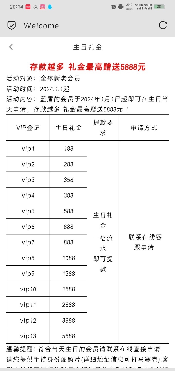 188起玩过的老哥可以看看,我看这台子生日礼金没啥要求,而且彩金送得挺高的,最近几天应该大部分老哥都有特邀回访,玩过的vip1起可以去P图领取,我是用的豆包P图过的,我是vip2,领了288不过一把没了